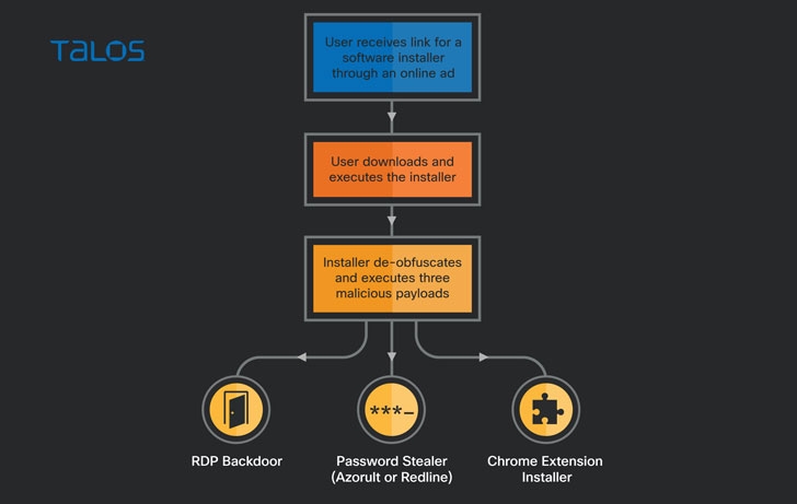 A noteworthy aspect of the intrusions is the use of malvertising as a means to strike individuals who are looking for popular software on search engines to present them links to download fake installers that drop a password stealer called RedLine Stealer, a Chrome extension dubbed “MagnatExtension” that’s programmed to record keystrokes and capture screenshots, and an AutoIt-based backdoor that establishes remote access to the machine.