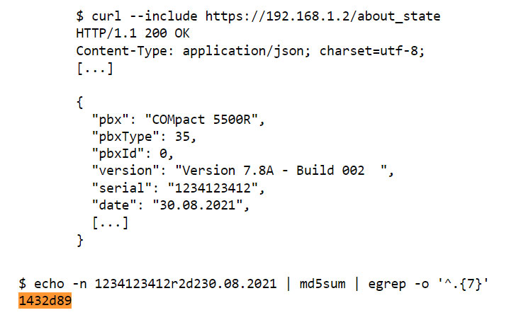 Follow-on investigation by the German pen-testing firm revealed that “the corresponding password for this username is derived by concatenating the PBX’s serial number, the string ‘r2d2,’ and the current date [in the format ‘DD.MM.YYYY’], hashing it with the MD5 hash algorithm and taking the first seven lower-case hex chars of the result.”