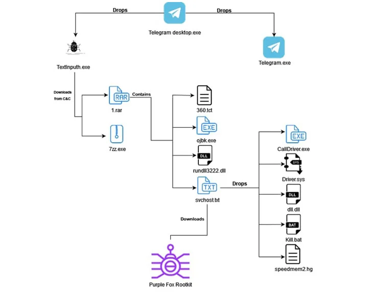 “This threat actor was able to leave most parts of the attack under the radar by separating the attack into several small files, most of which had very low detection rates by [antivirus] engines, with the final stage leading to Purple Fox rootkit infection,” researcher Natalie Zargarov said.